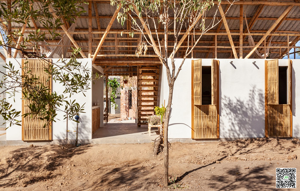 该竹结构建筑门廊包含一个大阳台、一个大房间,一个可以用于传统烧烤的半开放双层厨房和餐厅,一个独立的浴室等。竹子作为该建筑的主结构,与混凝土相比不会吸收湿气。竹结构外覆盖竹制板墙,板墙的外表面作抛光处理。坡屋顶由回收的聚合铝制成,隔热,耐用,并且不吸收热量,室内地面由抛光混凝土制成。随着当地居民需求的变化,这个建筑原型可以灵活地回应和调整,成为与当地居民共同发展和成长的建筑。