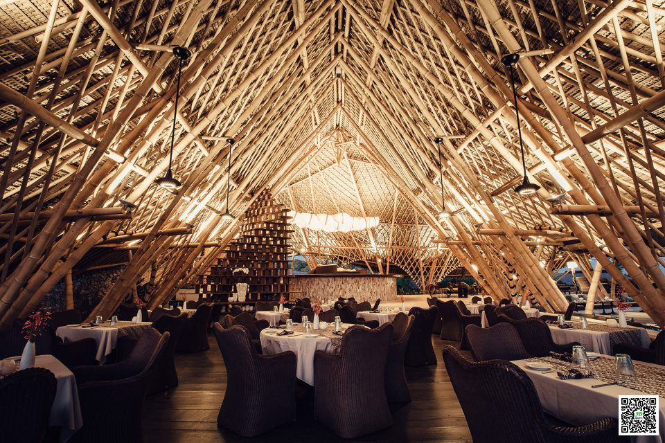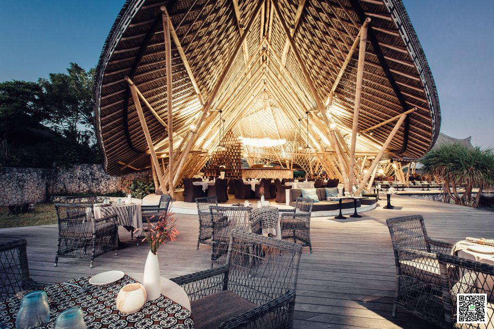 在风景优美的巴厘岛旅游胜地中心地带,栖身着几栋极具当地风情的竹建筑。在这里,屋顶茅草和翠竹这两种最具天然冷却效果的材料被应用于Suarga Padang Padang酒店的建造中,使整个度假酒店得以逃离热带小岛的炎酷气候,为来访者营造了舒适的旅居生活。该酒店以可持续建造方式为宗旨 ,大量使用回收木材,当地爪哇竹木,石灰岩砖,并雇佣松巴岛当地村民收集岛上天然的石材作为酒店建造材料。在水资源利用方面,酒店得益于屋顶雨水收集系统获得一百万升的回收水。而整个度假酒店则从太阳能电板中获得能量供给。