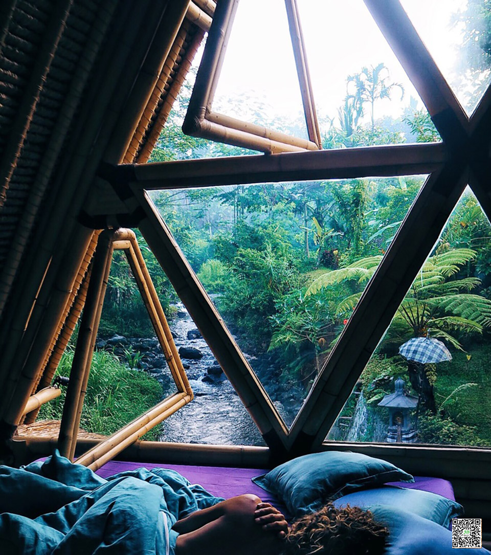The first bamboo house, called ‘Bali’s Hideout’, features a saddle roof and plenty of development space. It is an all-bamboo structure that also includes six main pillars and a thatched roof. The A-shaped roof provides the perfect opportunity for triangular Windows, which are the most prominent design of the whole building. The bamboo house extends outward, benefiting from the tropical climate, and also involves a comfortable outdoor shower located under a tree in the garden. The tree is the key throughout the bamboo house and garden, as if one is in a tree house.