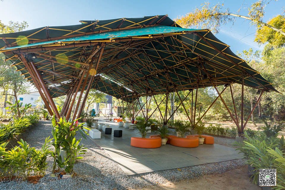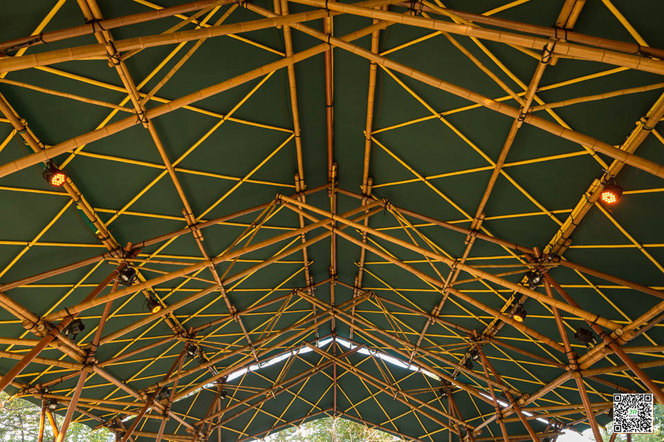 The pavilion is a movable, self-supporting bamboo structure that is self-pressurized by acrylic film and flexible textile joints. In the modular structure system, the roof span is 15x23m. Prefabricated space frames and articulated connectors in polyester cables and bio-composites can be quickly assembled to protect the bamboo strips from torsional stresses. The design of the connection allows for complex free-form geometry and creative lightweight assembly procedures. Physical and computer models are developed for shape finding of self-supported bamboo structures. The structural design and analysis were carried out through interactive numerical models, scale models, and full-scale prototypes.