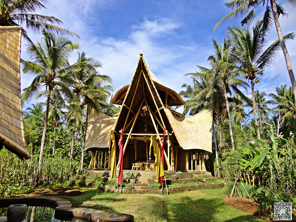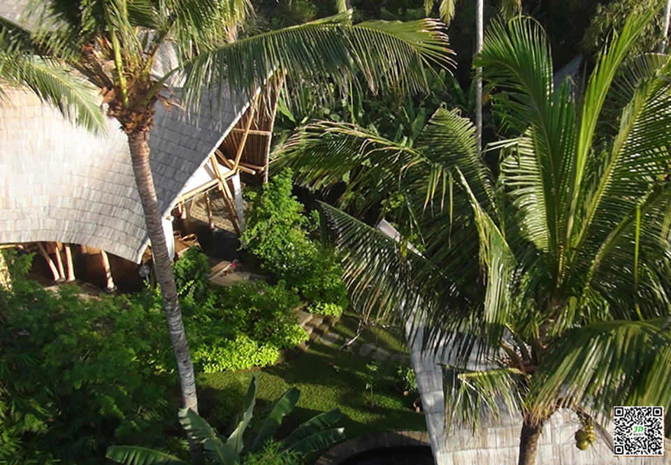 Garden House竹屋酒店坐落在椰林中。它有两间卧室和一个露天起居室和厨房区域,顶部竹屋顶下的元素保护,并打开周围的永久文化花园床。