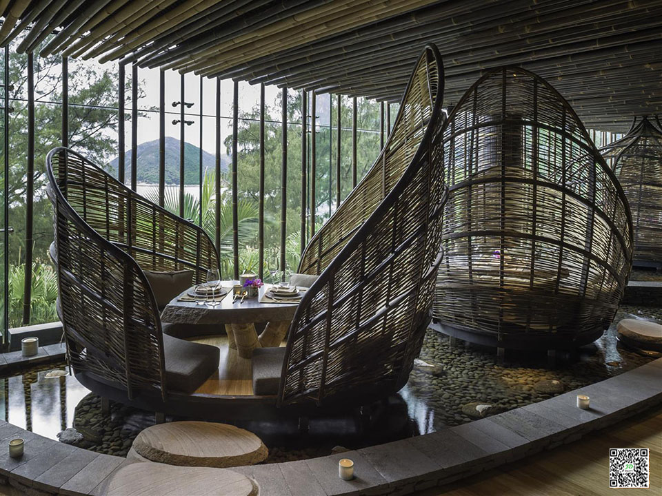 The concept of TRi comes from the Balinese philosophy of TRi Hita Karana, which is the combination and balance of three elements: human, natural and divine. Guests pass through three areas during their TRi experience — Kampung (village), Kebun (garden) and Hutan (forest). Bali’s incredibly rich cultural heritage and unparalleled natural beauty inspired the design elements. Bamboo is the main material, but TRi also has Balinese metalwork, river tablets and traditional cloth. In repulse Bay, rivers, the ocean, daylight reflections, tree lines and distant mountains all play a role in TRi’s design.