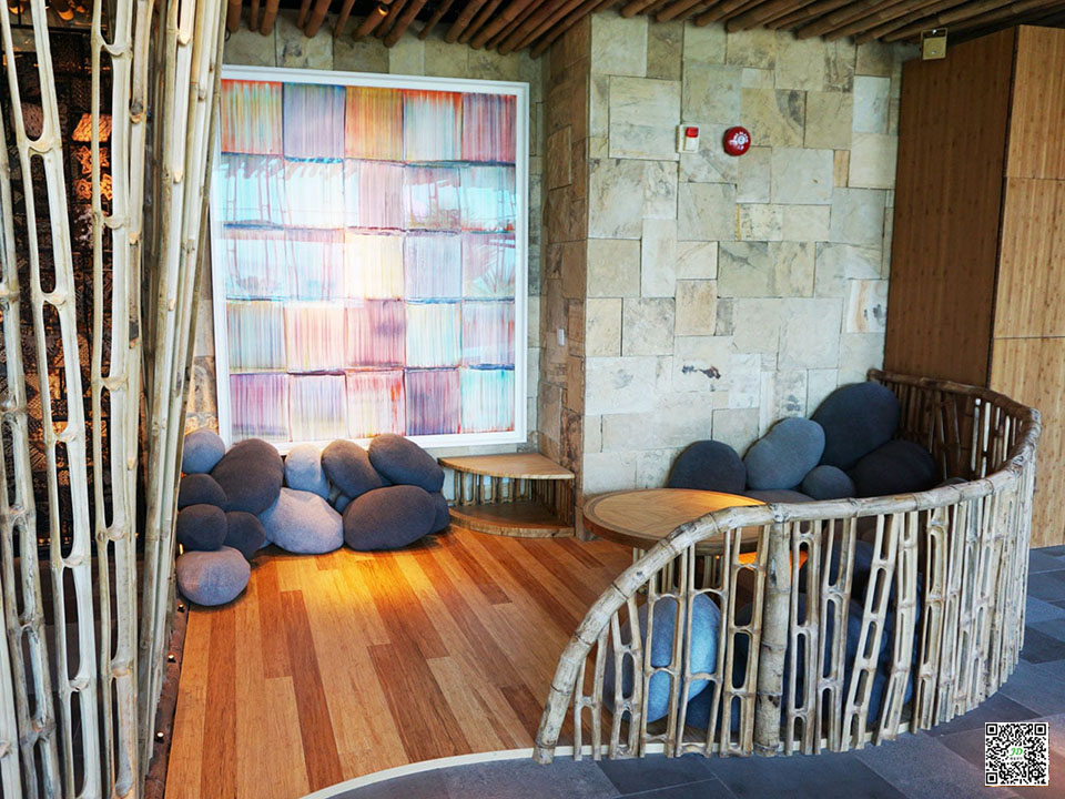 Finally, TRi’s guests come to pristine Bali, undisturbed riverside Bali, with ripples in the water, cascading ferns and wild bamboo forests. This space is free and wild, overlooking the peaceful river flowing in the sea. Along the far window is a curved terraced pond. Bamboo elements are tall, intact and naturally beautiful. “Bamboo was such a natural choice for the Tri Hita Karana concept. Not only is it a sustainable material, but it also has the spiritual function of representing wealth and prosperity, “said IBUKU interior architect Putri Wiwoho.