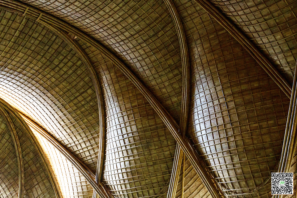 The project, a precursor of its kind, spans 19 meters and is made up of a series of interwoven 14 meter high bamboo arches connected by a saddle-faced grid that allows the arches to “escape” gravity from the hyperbolic paraboloid.