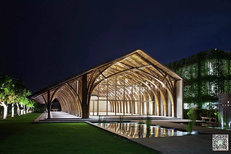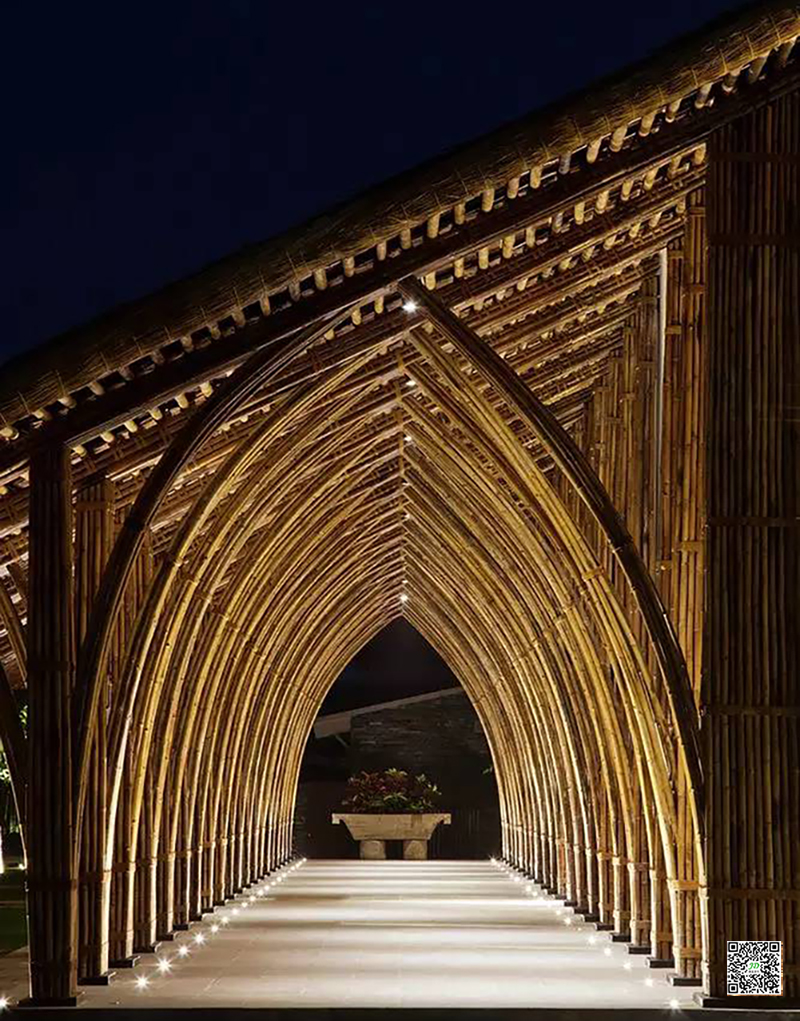 The arched appearance is created by bending the bamboos and is connected to the structure. Moreover, the recessed glass facade doubles as the glazed facade of the foyer.