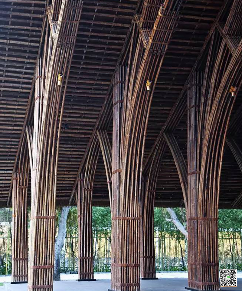 主竹结构框架全部使用竹子打造,大厅跨度为13.5米,走廊4米,屋顶高度9.5米。
