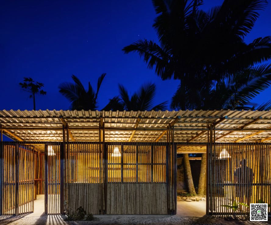“社区决定了这座建筑的所有内容和程序,以及过去 10 年不同时期建造的不同部分。”社区中心距海滩 50 米,面向大海,利用高架屋顶和最小化垂直墙,充分利用凉爽的横风,畅通无阻地穿过建筑物。该夯土砖提供自然保温和热质量,而用竹子结构框架,并在外观上门窗的帮助刺眼阳光屏蔽内饰。