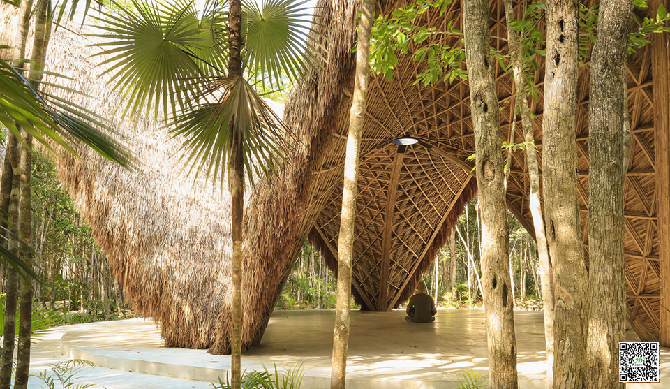 项目位于开发中心,寺庙坐落于原生丛林中的保留区,只能徒步进入,在其宁静自然环境下,非常适合思考和感受慢生活。 温柔的微风穿过丛林树冠和开放式结构,营造出斑驳的光影效果。 这一开放式五面竹结构能提供各种理疗和活动功能,包括瑜伽,冥想,工作坊和社区聚会。