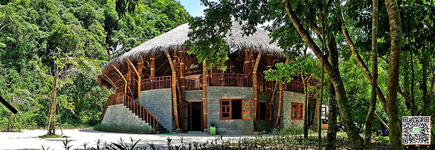 坐落在越南quảng bình的热带雨林中,一座竹结构茅草屋顶建筑结合了住宿、休闲和餐厅,供游客前往附近的自然溪流旅游。半开放式结构应对热带气候;这是一个容易发生洪水和暴风雨的地区。同时,该竹建筑展示了传统方法和当地原材料的使用。