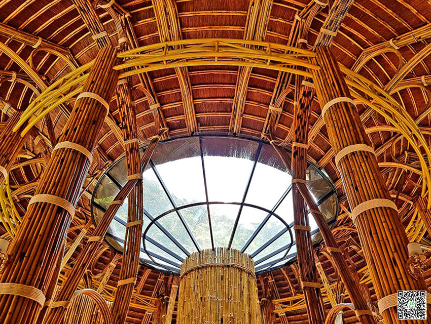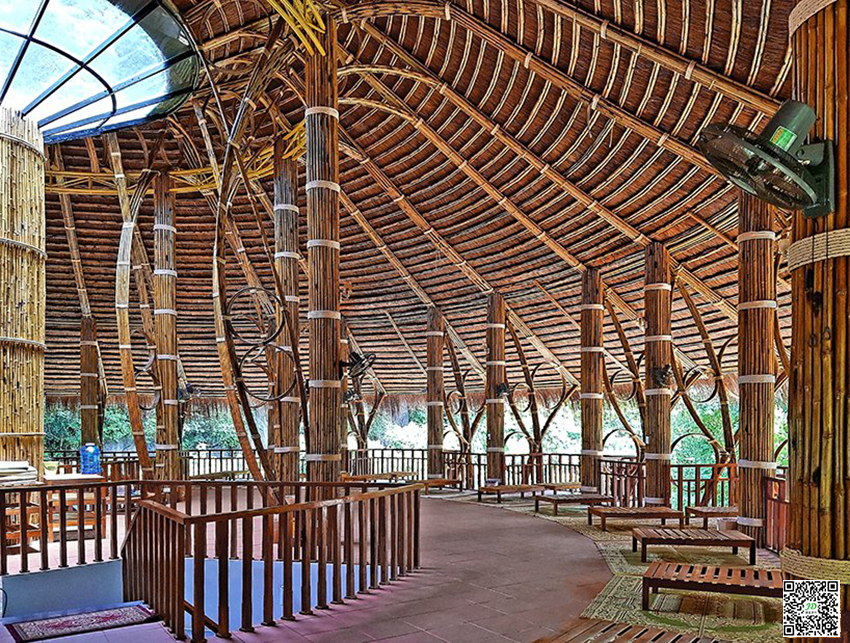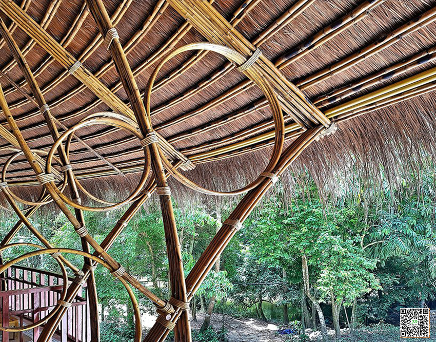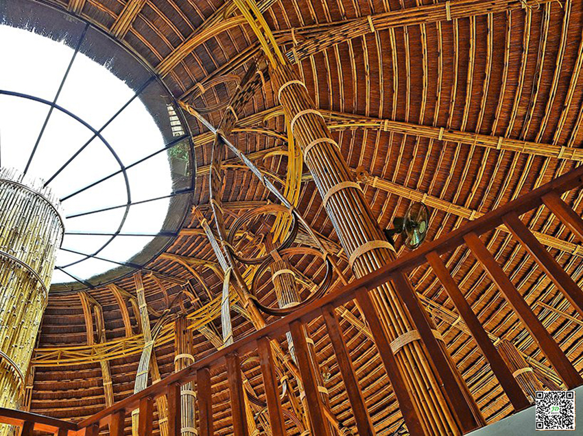a distinctive feature of the building is the use of bamboo. the natural and widely available material is manipulated and weaved into sophisticated patterns and detailing seen on the trusses. on the high level this is especially evident, where the reinforced concrete pillars are wrapped with nulgar bamboo tree material and leaf to complement the rest of the bamboo enveloped interior.