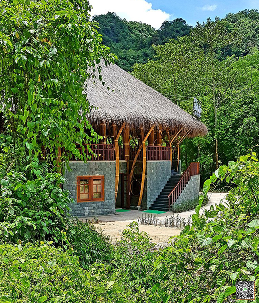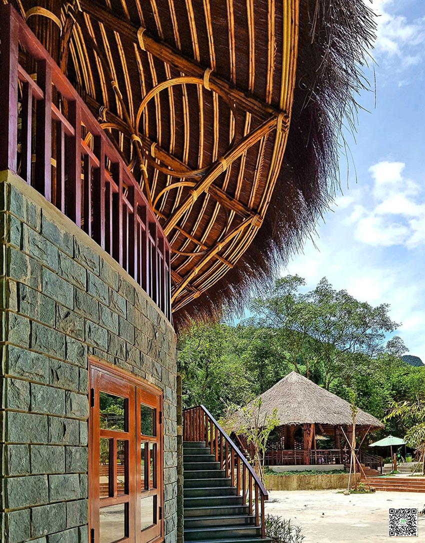 nestled among the rainforests of quảng bình in vietnam, a thatched roof building serves as a building combining accommodation, relaxation and a restaurant for visitors traveling to the nearby natural streams. the semi-open structure addresses the tropical climate; an area prone to flooding and storms. at the same time, the architecture showcases the use of traditional methods and locally sourced raw materials.