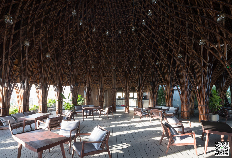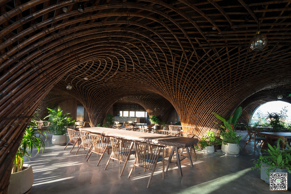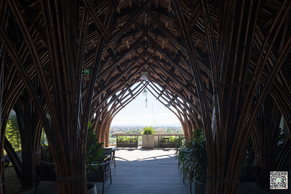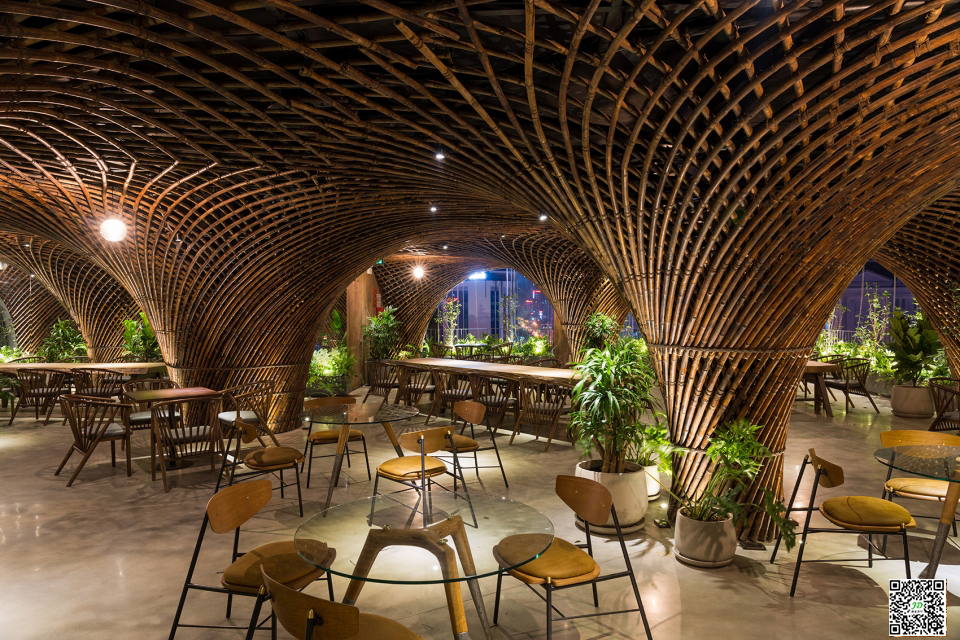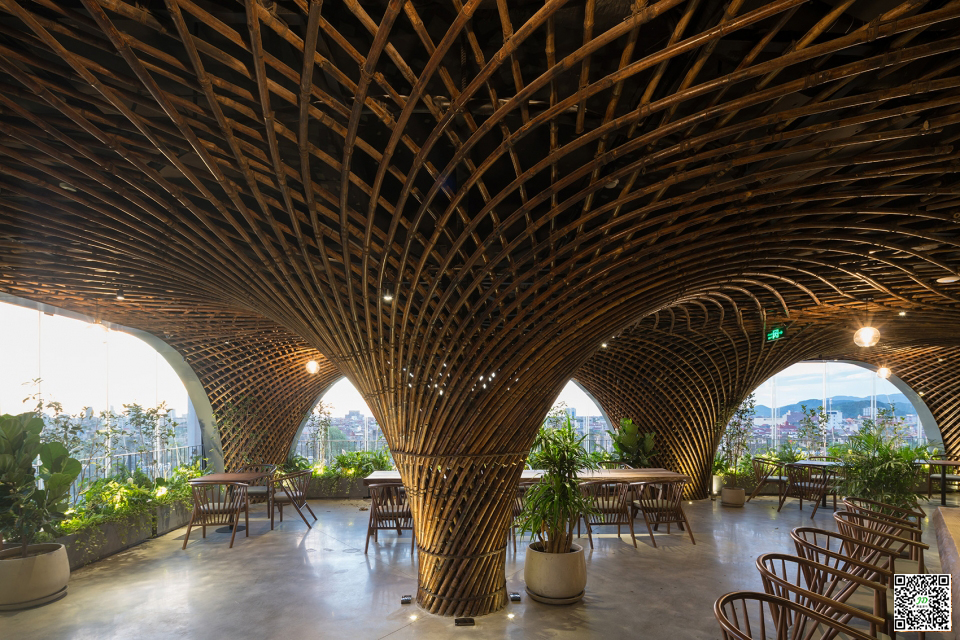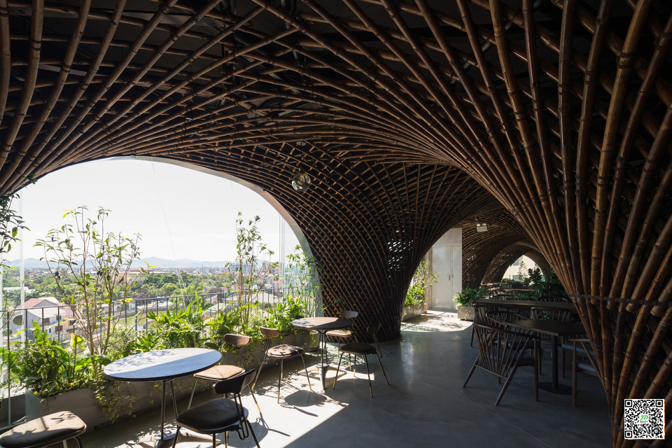 在越南竹建筑的顶层(7层),建筑师将竹材覆盖在既有的混凝土结构之上,打造出一个有着丰富质感的空间。独特的竹制屋顶使街上的行人能够很快辨认出咖啡厅的位置。既有的支撑结构被隐藏在10根竹柱内部,划分出优美且具有私密感的空间。尽管这些“洞穴”带来的是一种较为隐蔽的体验,但从任何角度,人们都可以欣赏到周围的城市美景。