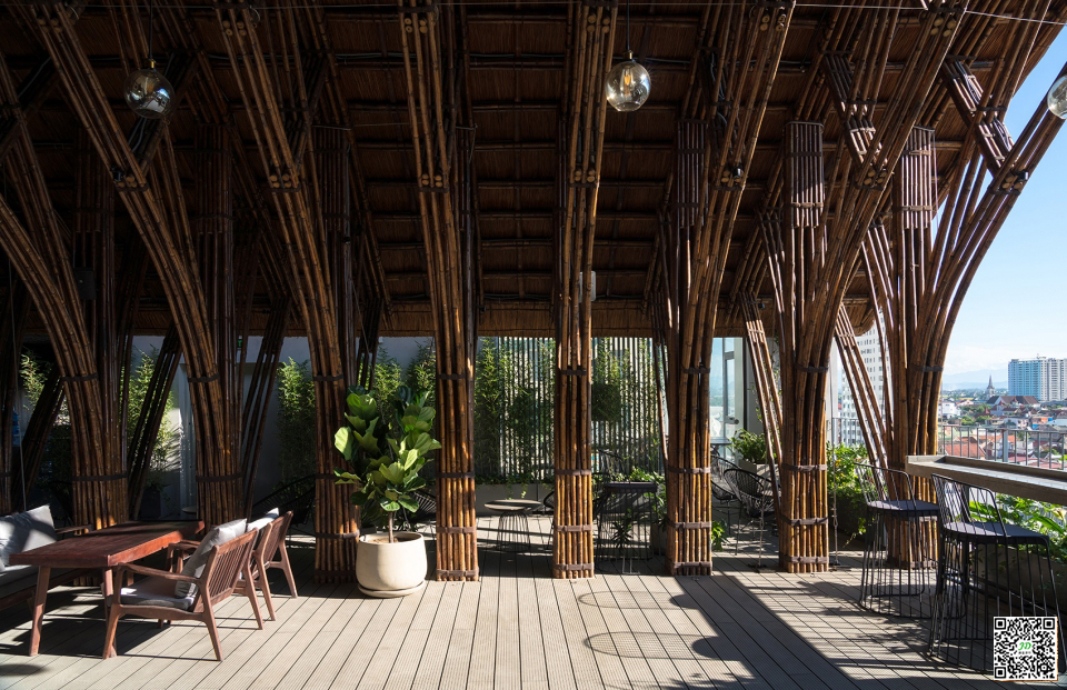 The challenge was to create an impact on the building by inserting a new structure with unique and local material. After studying several local materials such as brick, stone, etc we chose bamboo to work with. Through our experience, we know bamboo is easily to access in this tropical climate which reduces construction time and budget. The essence of using bamboo in this project is “lightness”. As bamboo which can be lifted up by a few workers and easily transport to the highest floor by a crane. In addition, it is possible to install the bamboo structure without any additional structural support.
