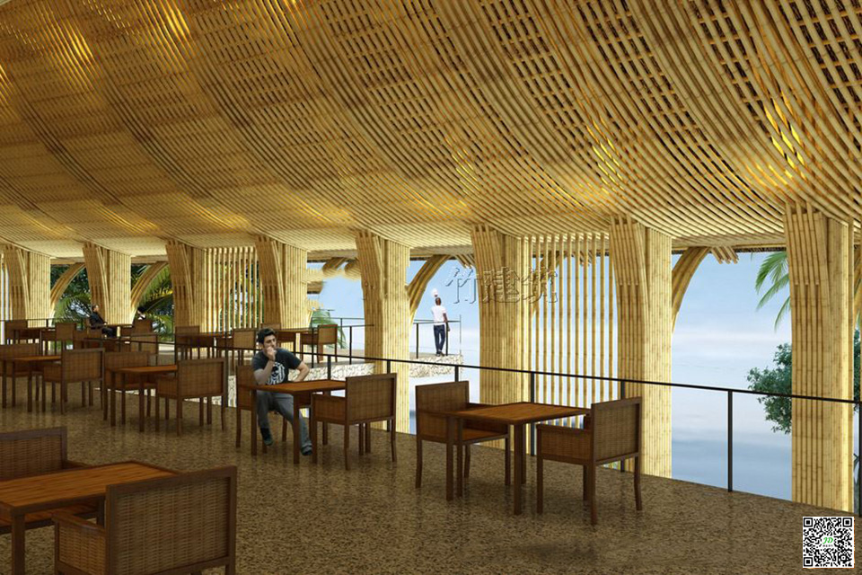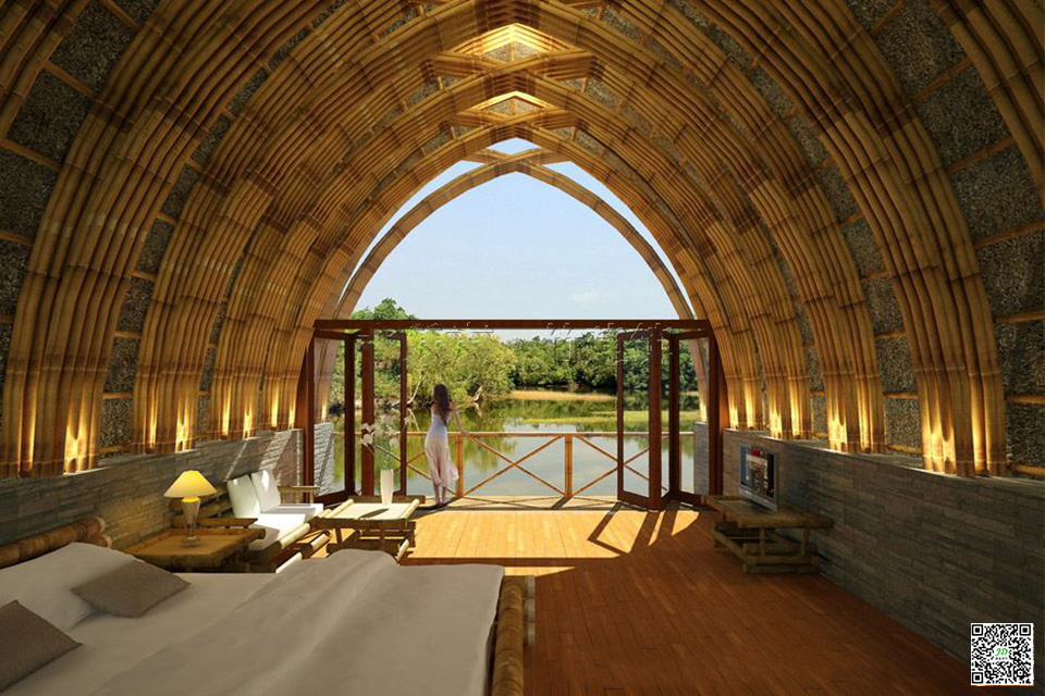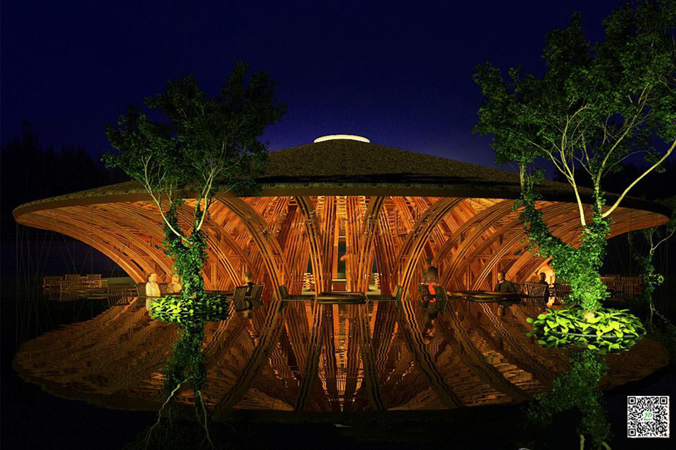 The different forms of bamboo structure through the use of different methods create an eco-friendly atmosphere for this luxury resort. The dining room and bungalow are pure bamboo structures built on a concrete base that floats in the river, while the SPA is a combination of bamboo interior finishes with a thin-walled concrete shell structure.