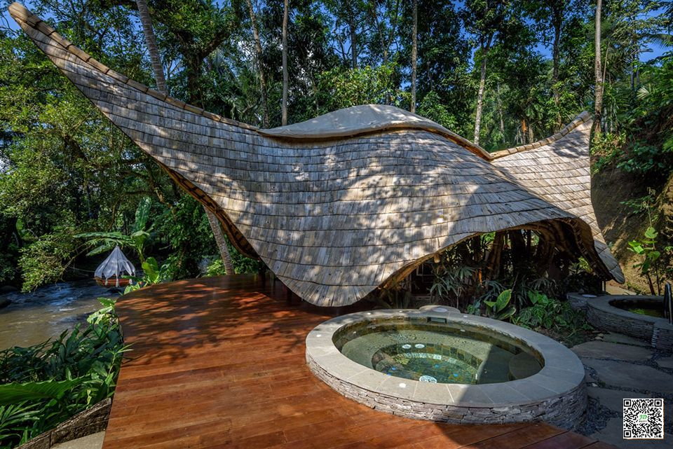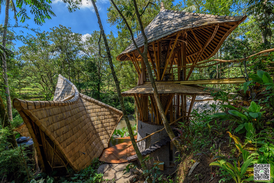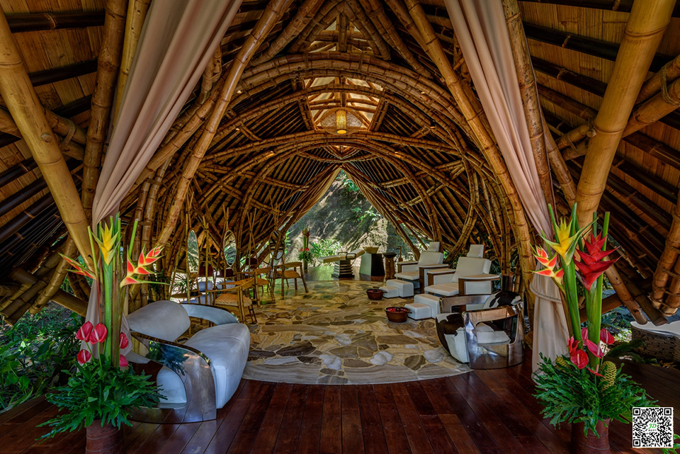 这是一座全竹林竹建筑的水疗中心,建在陆地上,利用各种能量,从河流的不断流动到物业本身的能量。