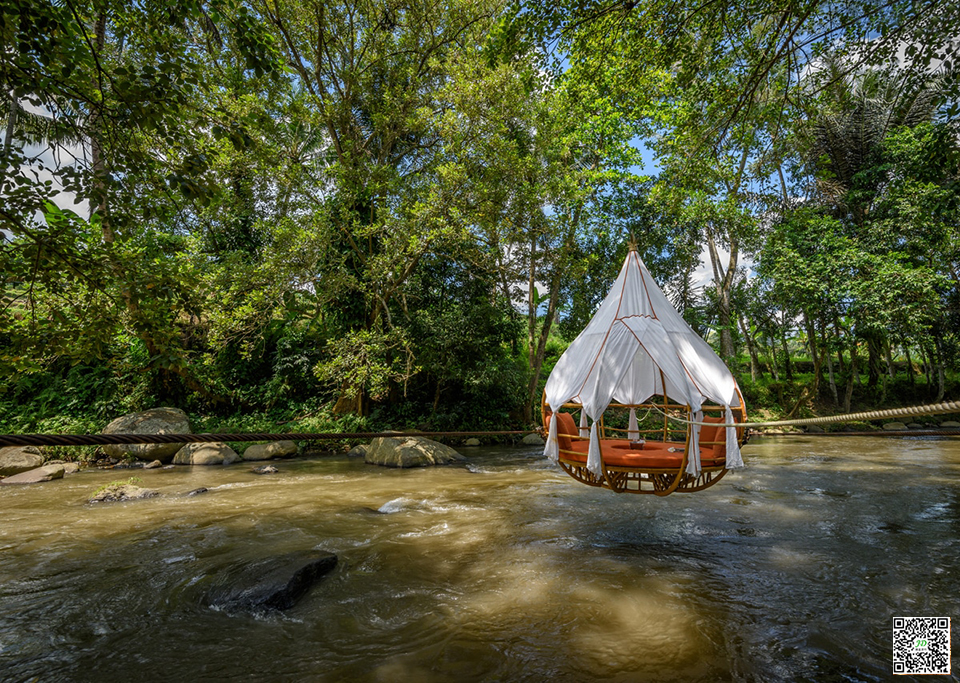 这个地点位于河边和五米高的悬崖之间,水从那里流下来。如果你要在河上,那么你应该真正体验河流并感受水 – 所以我们还在Ayung上方的电缆上悬挂了泪珠。