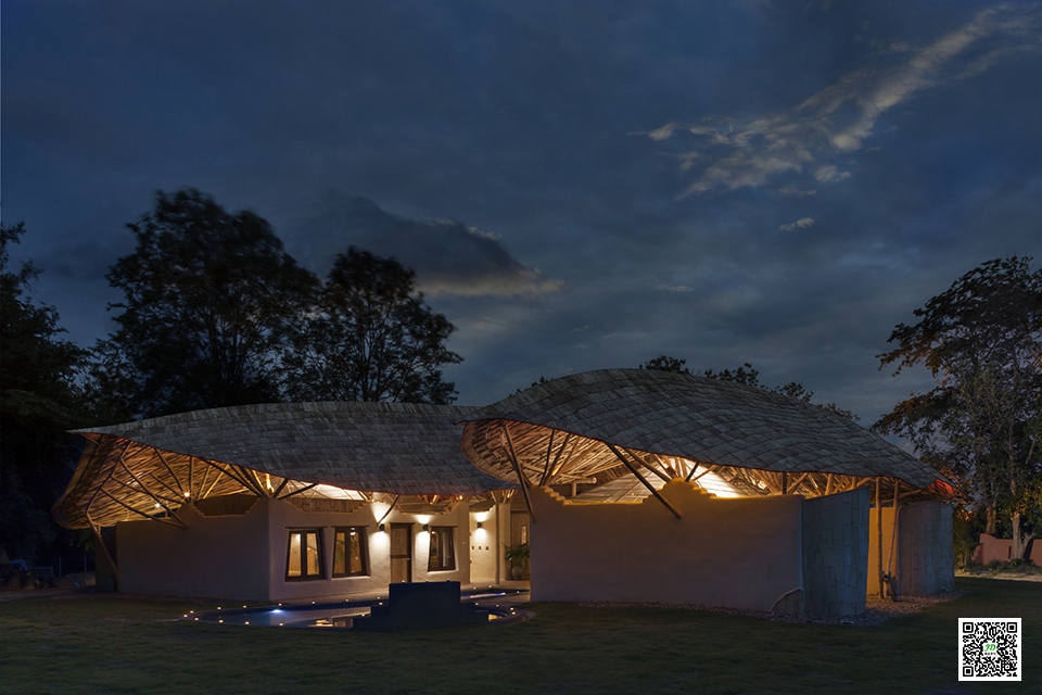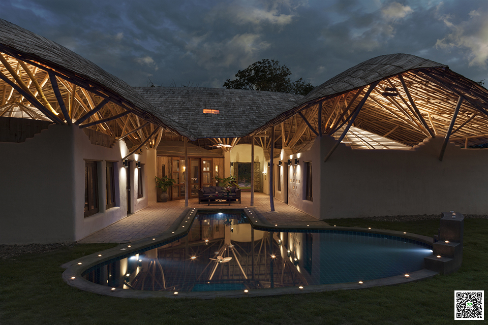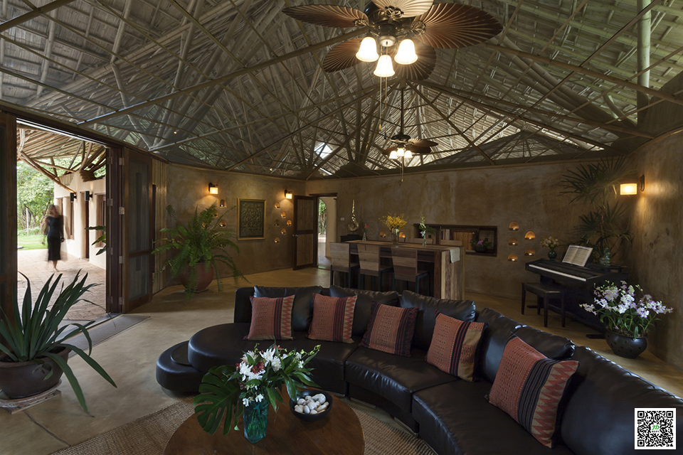 The entire roof is sandwiched between bamboo and bamboo shingles with tar paper for rain protection and insulation, creating an open, naturally ventilated space. The walls are made of bricks made of a very fine earth, and the floor is partly rammed earth and partly clay-concrete mixture. The original India Gate gives the whole project an Oriental feel. The villa is a modern luxury tropical sanctuary with both inside and outside presenting nature.