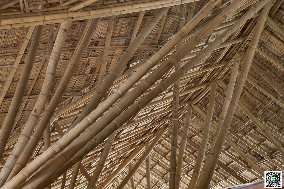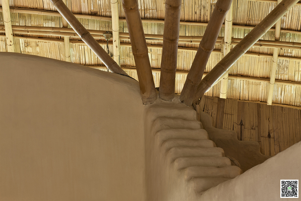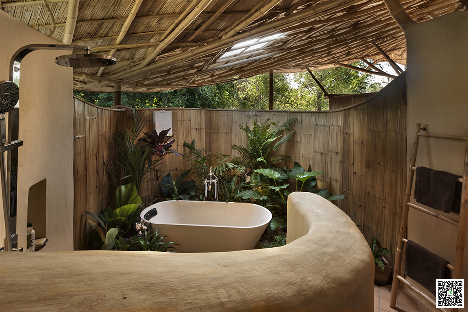 整个竹屋顶用焦油纸夹在竹子与竹瓦之间来防雨和保温,营造了一个开放的,自然通风的空间。墙体用一种非常细的土制成的砖砌成,地面部分是夯土,部分是粘土混凝土混合的。原始的印度门给整个项目呈现出了一种东方风格。这座别墅是内外均呈现自然的现代化豪华热带避难所。