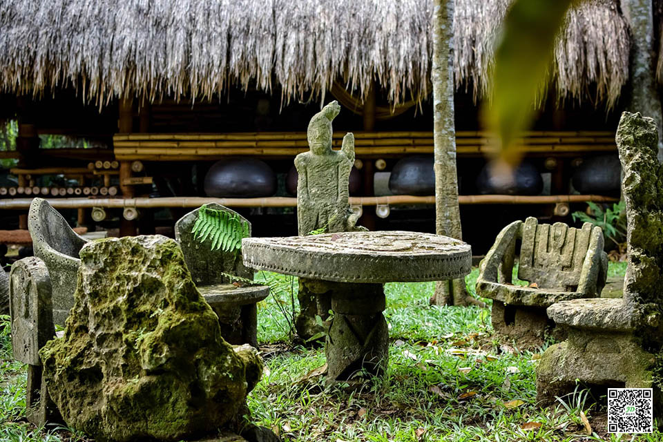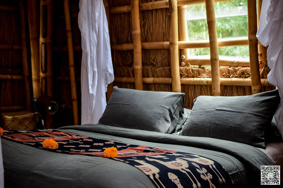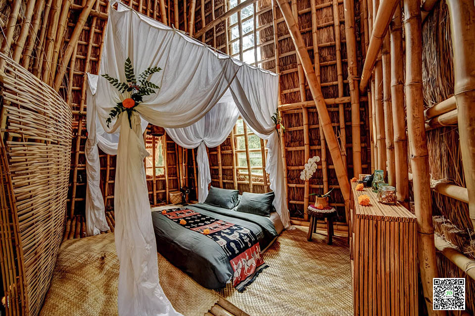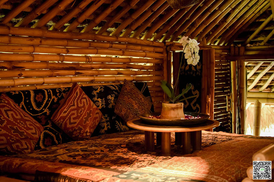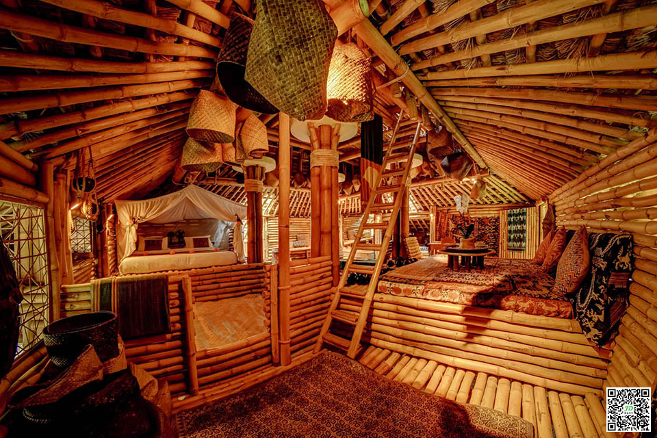 这间竹屋房子配有漂亮的手工编织纺织品、传统刀剑和天然纤维篮子,房子的外面被竹制甲板包围,甲板上有吊床,白天可以休息。