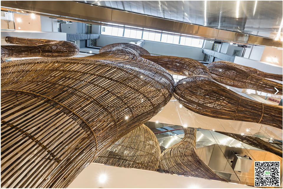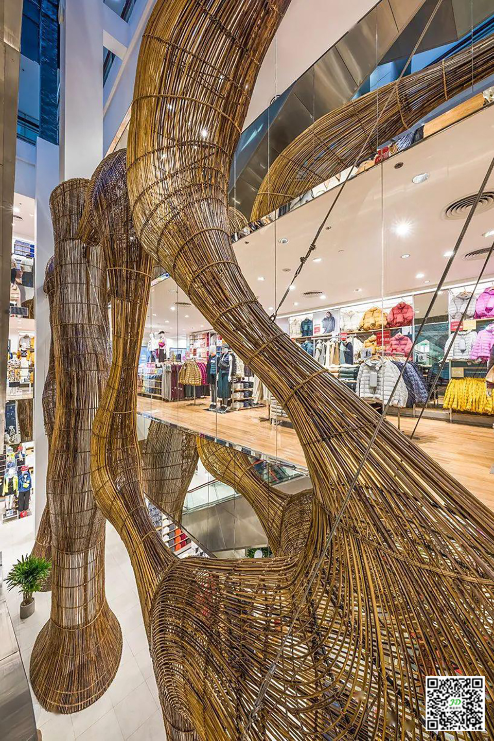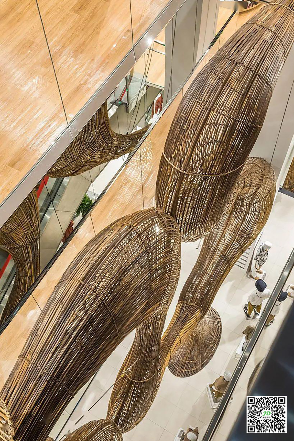 总部位于越南的VTN建筑师事务所,将其作品 “鸟巢 “引入了位于胡志明市的优衣库旗舰店,这个流动的装置由细长的弯曲的竹子编织而成沿着零售空间的主扶梯动态延伸到三层。