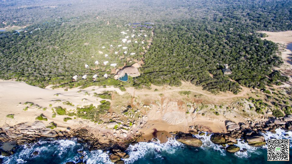 Positioned at either end of the site, the main facilities are organised as outcrops of boulder-like pavilions clustered organically together. Larger open air volumes intersect with smaller enclosed domes that house more private functions. Connecting the welcome area near the entrance with the waterfront bar, restaurant and library is a meandering natural landscape lined with clusters of cocoon-like tensile membrane structures called Loopers. Each cluster, which resembles a leopard paw print, overlooks a watering hole designed to attract wildlife. Guests can admire the wildlife from the safety of elevated decks at the front of their tents. The spa is set back from the beachfront, nestled amid a grove of Palu trees.