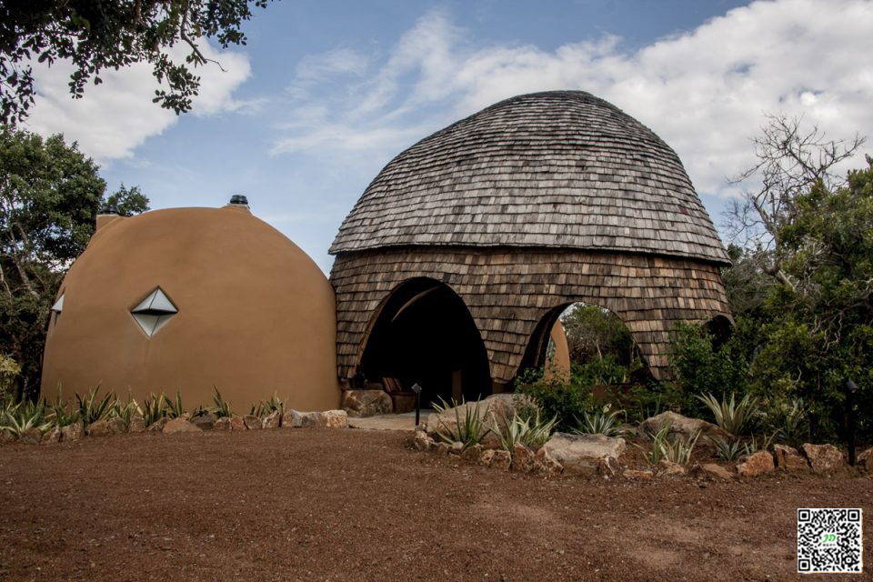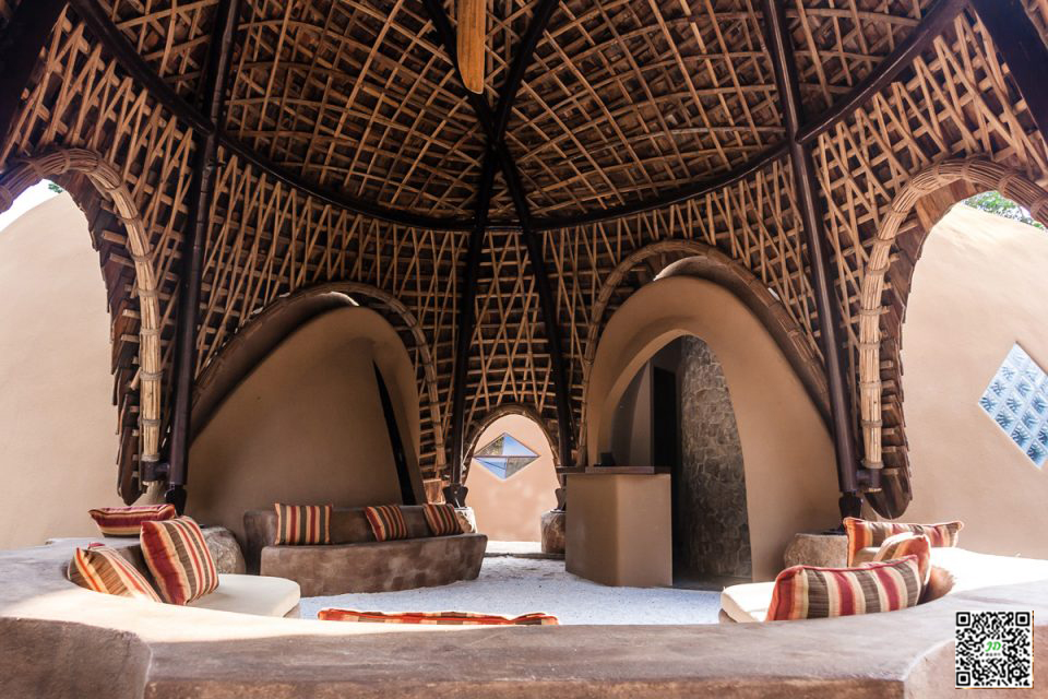 Located near the entrance gate, the welcome area creates a true sense of arrival. An open reception awaits guests after their long journey. The interior centres on a curved mud-brick lounge with an impressive tiered bamboo chandelier above. The arched openings of the bamboo dome of the welcome pavilion intersect with two smaller enclosed ferro-cement domes – containing the offices and washrooms – clad in a rough exterior pebble dash finish. The open end of the office dome incorporates the check-in desk backed by a sparkling quartz wall, creating the impression of looking inside a geode, with its rough stone exterior and crystalline interior.