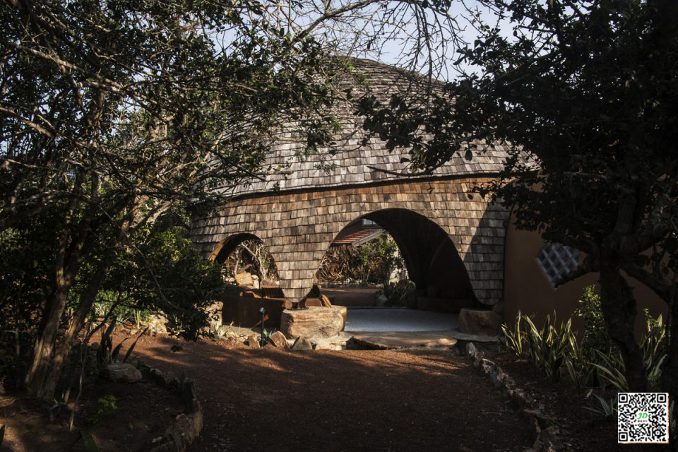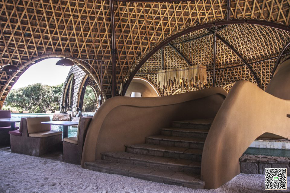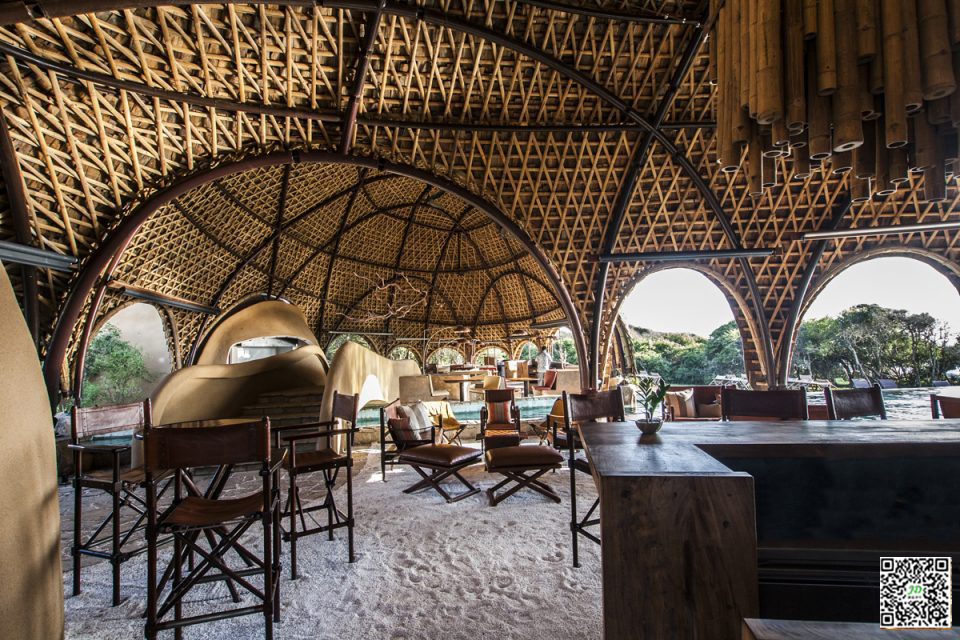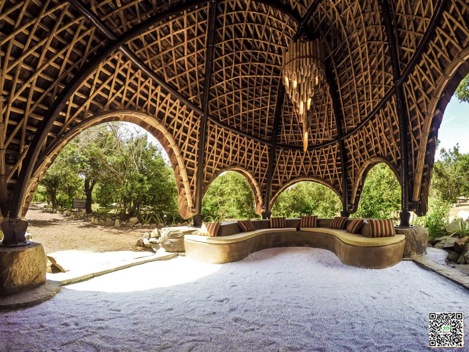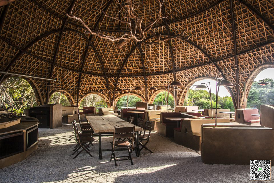 ▼圆顶由编织而成的竹网结构搭配柚木瓦片而成,the vaulted construction is crafted from a woven grid shell bamboo structure clad in reclaimed teak shingles