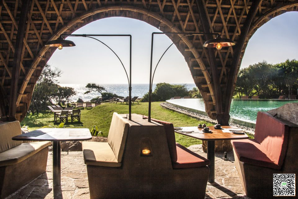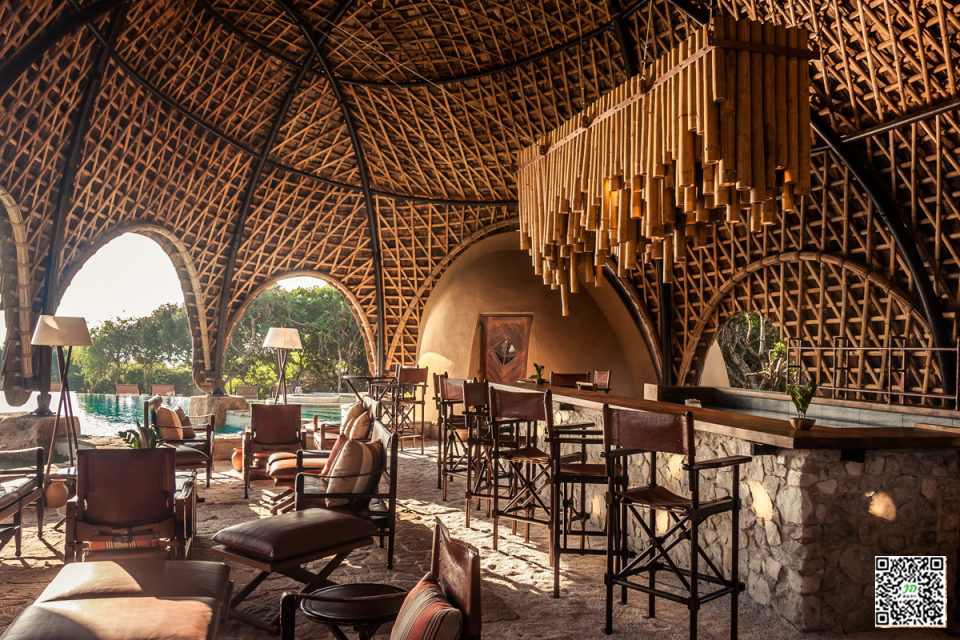 酒吧柜台由一个闪亮的石英墙和一个铜管制成的瓶架打造成视觉的焦点。如钟乳石般巨大的竹子吊灯将空间印象雕刻的更加深刻。酒吧外围的泳池是该酒店另一个主要组成部分。酒吧与餐厅通过一座小桥相连,而泳池则恰好从两者之间穿过。来访者可以从度假区一侧游行40米穿,穿越建筑并最终到达滨海区。此外,该泳池还帮助冷却环境,并借由日光,在巨大的竹子穹顶中留下波光粼粼的水影。夜间在光导纤维灯的映衬下,泳池如夜空般闪烁。从泳池中出来,在酒吧的坐席上点一杯饮料,或者到泳池侧边的休息区喝酒谈天都是不错的选择。怀旧的家具摆设唤起了对那个充满探索与冒险时代的追忆。该空间采用皮质,铜,红木,石英和石英鹅卵石地板为主要材料。