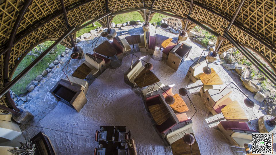 临近入口大门,迎宾处营造了真正的莅临之感。开放的接待中心让远道而来的游人们都能获得舒适的等候环境。该空间焦点为一处泥砖筑曲面墙休息室,由竹子打造的巨大枝形吊灯悬挂于此,给人带来深刻的印象。迎宾处竹做穹顶的拱形开口,与两个较小的钢丝网水泥建筑相交。这两个小建筑由粗糙的碎卵石铺面,作为办公室和洗手间之用。办公室一侧打开形成酒店登记柜台,柜台的背后是一面闪闪发光的石英墙。这一设计给予来访者一个特别的感受:如同从岩洞向内望,绚丽的水晶就掩藏在这粗糙的外貌之下。