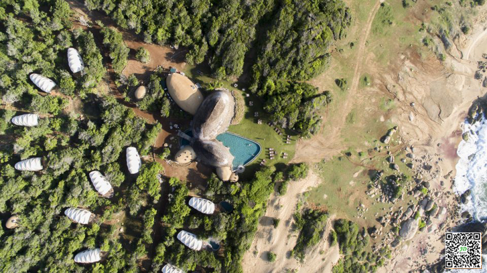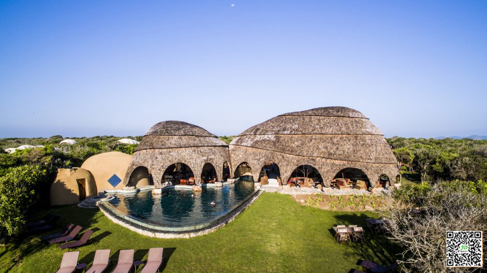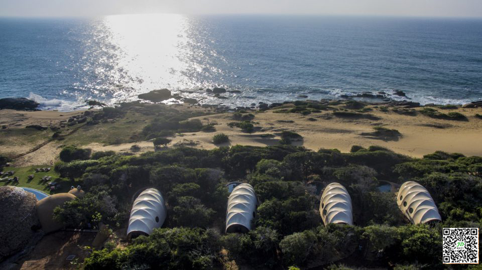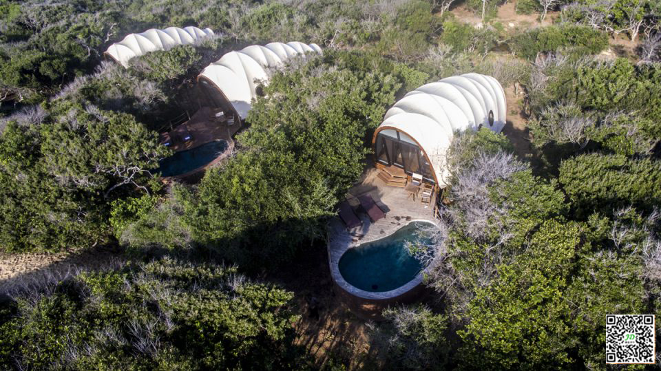 该度假酒店的主要服务设施分设场地两边,俯瞰过去形如露出地面的巨大卵石。较大的公共露天空间与较小的私密空间在相交的拱顶下获得连接。入口迎宾处,酒吧,餐厅和图书阅览室彼此相连,如同场地中的天然景观,一簇簇茧状的张力膜结构则散布在场地之中。群聚的张力膜结构单体如同豹爪一般印刻在场地中,而位于其下的水池,则吸引了无数野生动物前来光顾。在此休闲的游人们可以栖身于较高处的甲板上,俯瞰这些到访的不速之客,保障了游人的人身安全。温泉浴于海岸处略向后退,掩映在一片Palu树林之中。