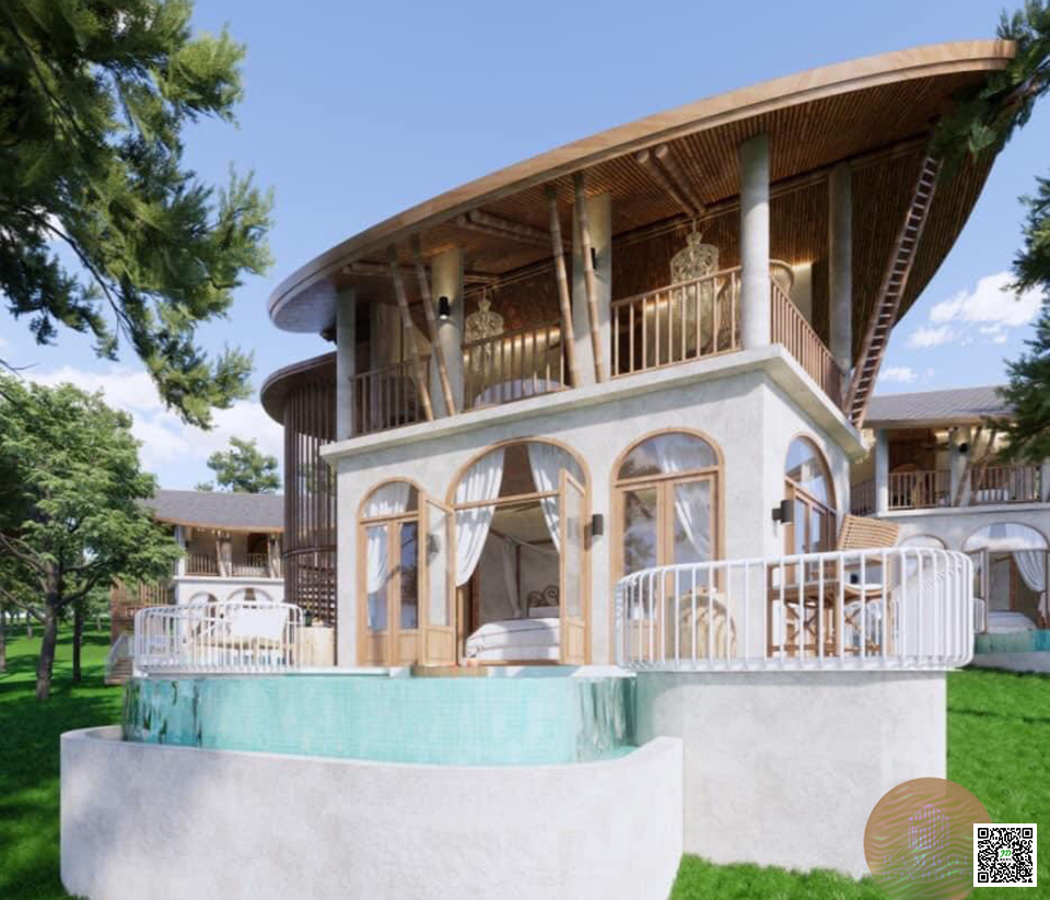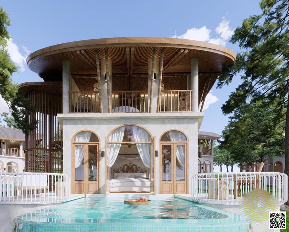 这是泰国一座用竹子打造的高端竹别墅,一共有两层,竹别墅屋后边就是一个游泳池,在泳池里绝对能拍出那种网红照片。整栋楼几乎都是用竹子装饰的!精致的竹别墅是要将竹建筑筑融入周围的环境与风景之中,既要提供如住家般舒适隐逸的环境,同时也要在公用空间展现无尽动感。