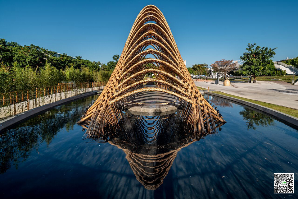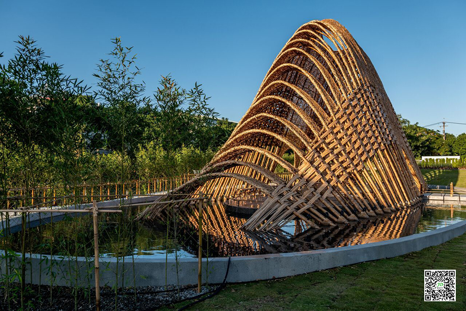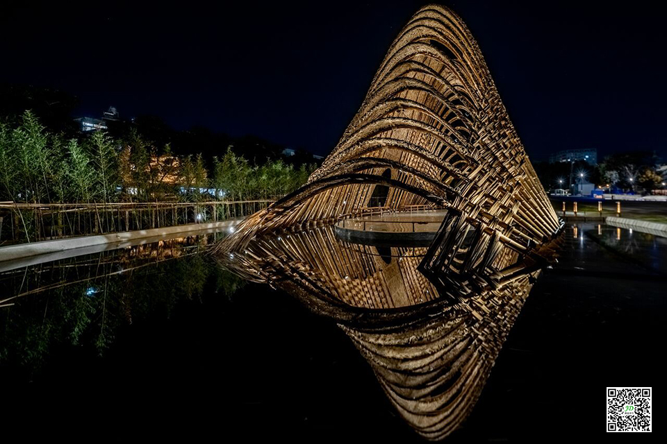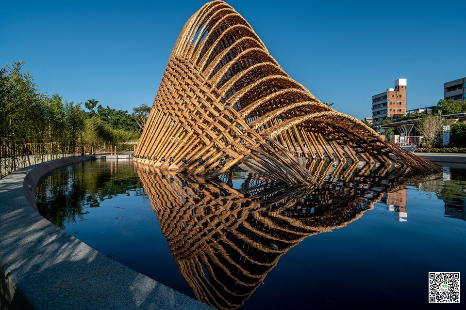 按照台中世界花艺博览会的主题——台湾之美,事务所从中央山脉的景色中获得灵感,使竹亭的外观看起来像是一颗种子,然后竹亭从地面破土而出,竹亭四周有水包围。不论竹亭室内外,竹亭都能与大自然无阻地联通。给参观者的感觉就像是在竹林中行走一般,竹亭强化了人们的体验感。当他们抬头时,可以仰望森林顶端的天空。