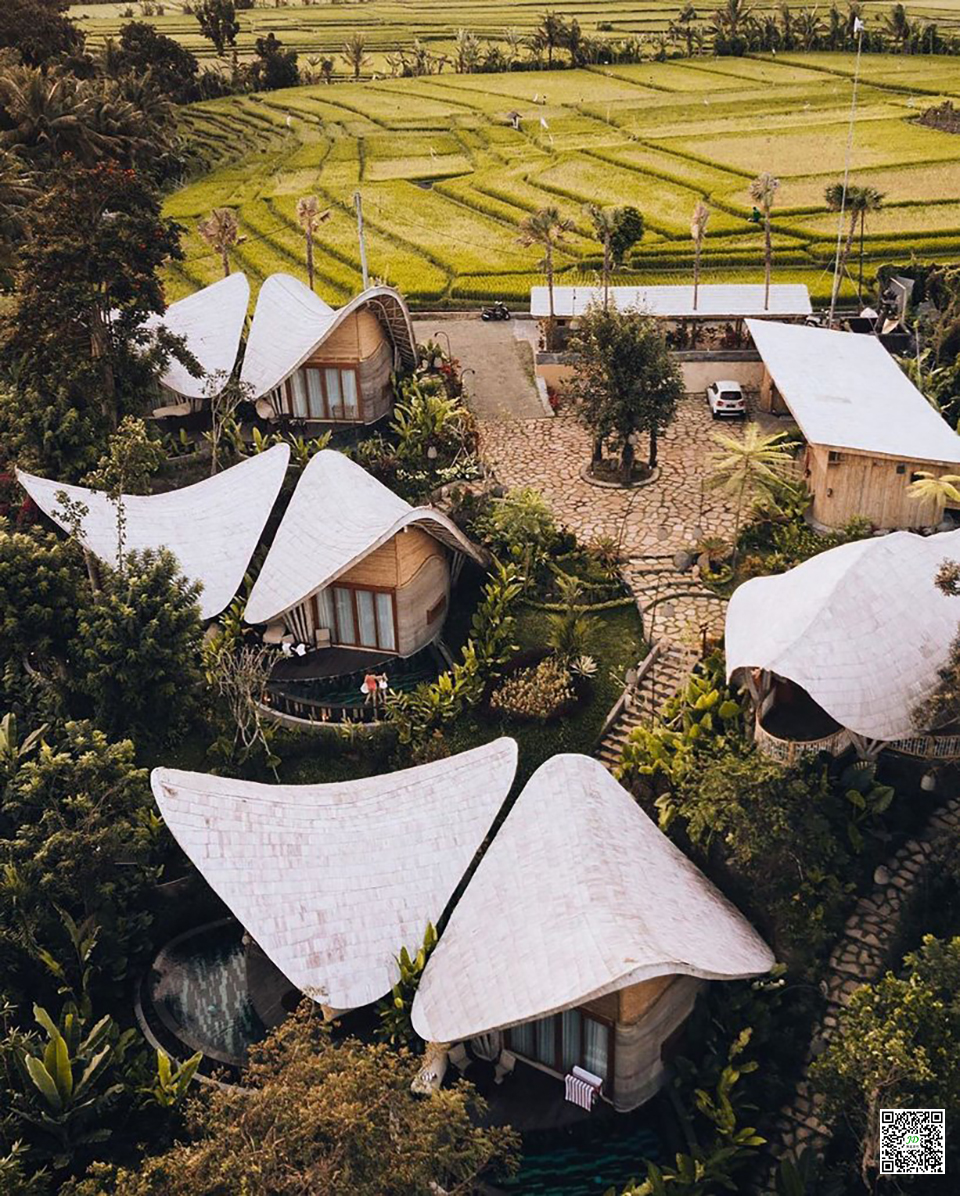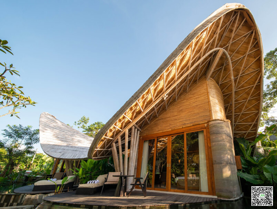 Everyone is expected to have a unique design, but the common ground with bamboo architecture and the warm tone of rammed earth make up the resort. The curved shape of the roof can be viewed from different heights and angles, while the reflection of the meandering pool below increases the effect.