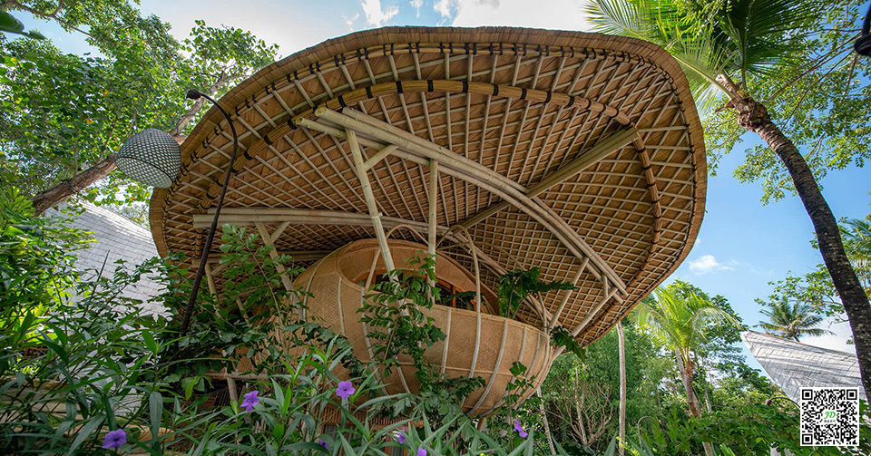 The rest of the structure is made of bamboo, most of which is harvested from this place. Not only is this fast-growing material incredibly sustainable, its flexibility means that it can create spaces that echo the richness of tropical life. Architectural objects have been created. They seem to biologically deform from the surrounding elements, but actually grow from the ground and germinate in the rich vegetation. Yoga studio is such a building, it is indeed floating down from the edge of the cliff, there is a cantilever structure supporting a parabolic bamboo Pavilion.