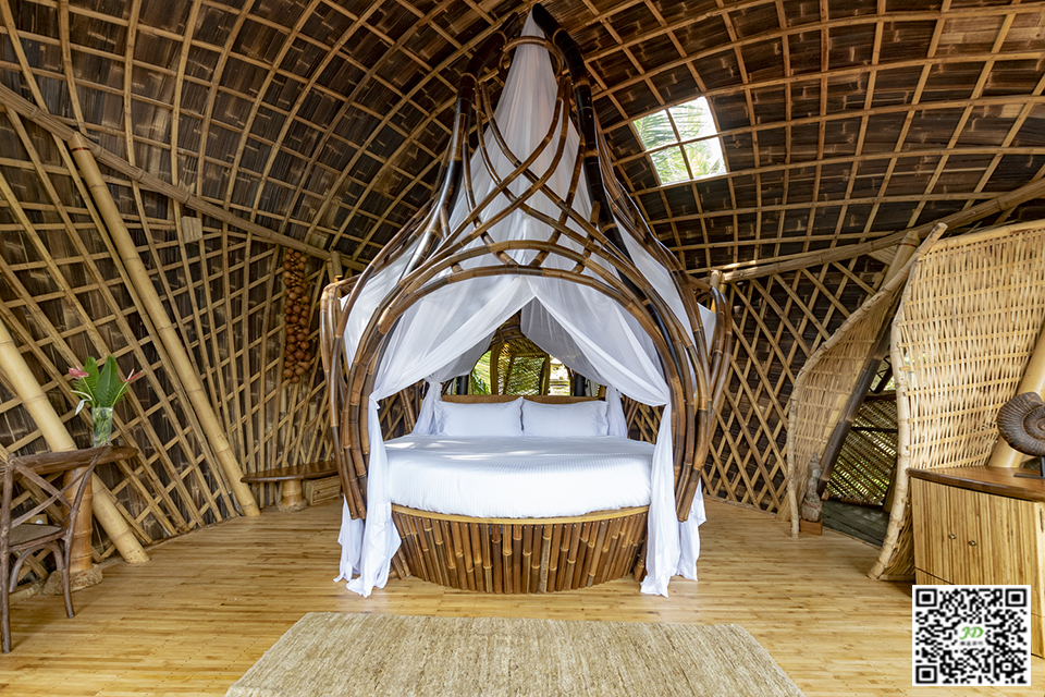 The ceiling of the tree house is 3 cm wide × 2.5cm thick × Made of 4-meter-long bamboo slices, it forms a grid like shell, and its strength comes from its double bending. The overall modeling reflects the integration of architecture and environment, and the relationship between space and nature. The interior floor is also made of bamboo, allowing a smooth transition to a wooden terrace. This moment in the building highlights the wallless space that keeps the interior and exterior together.