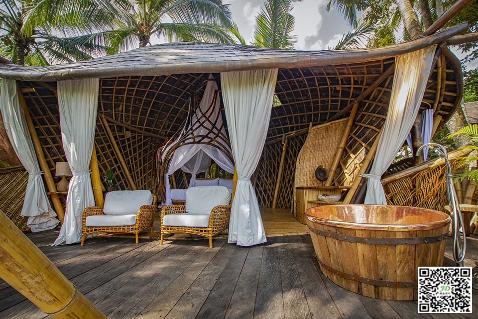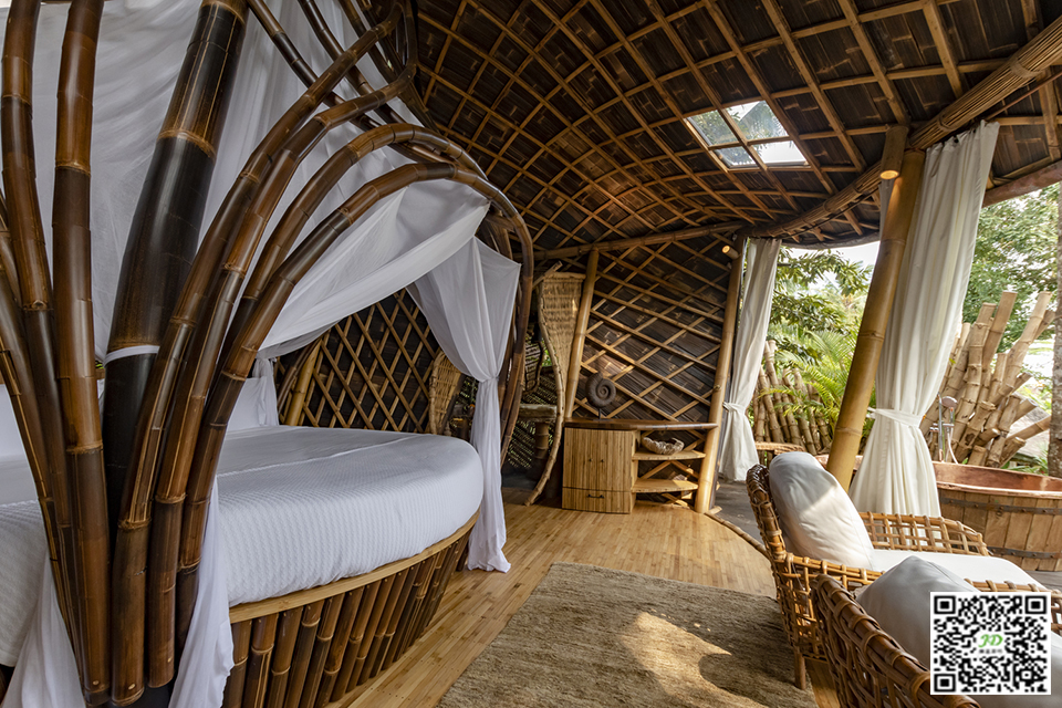 室内设计向竹子的美丽和神圣致敬,工作室定制了一张圆形鸟巢状床。厕所洞穴和淋浴等其他特色从附近的丛林中获得灵感。每个角落都是一种体验。对于那些寻求在巴厘岛文化背景和风景的剪切和奇迹中冥想和放松的人来说,这是一个独特的有机空间。