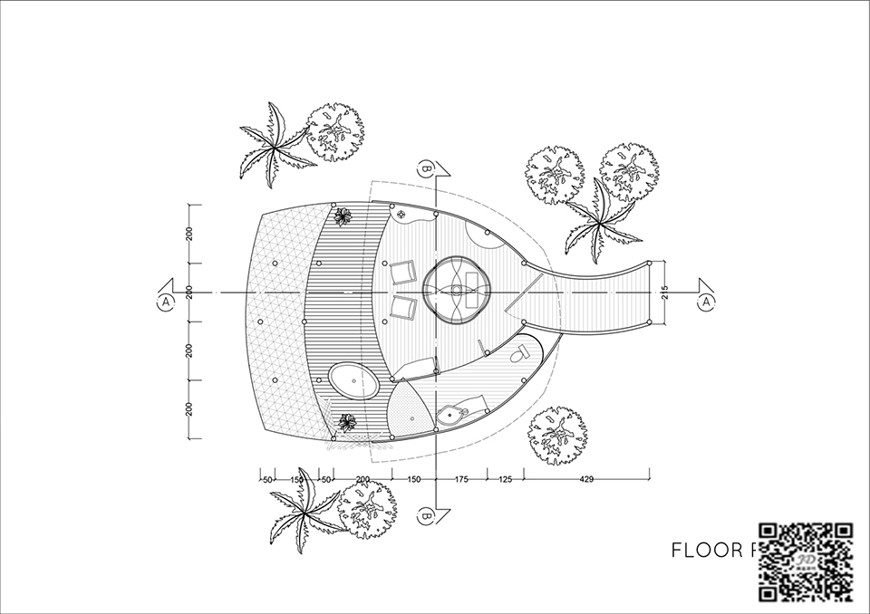 树屋的天花板由3厘米宽×2.5厘米厚×4米长的竹片制成,形成了一个网格状的外壳,其强度来自其双重弯曲。整体造型体现了建筑与环境的融合,空间与自然的关系。内部地板也是由竹片制成的,可以平滑地过渡到木质露台。建筑中的这个时刻凸显了室内和室外保持一体的无墙空间。