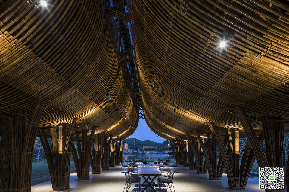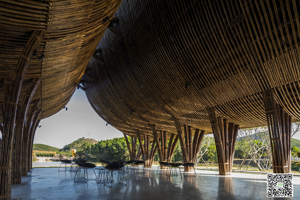Surrounded by four lakes and nearby mountains, Huoan YINWEI park is home to trees, flowers and various other vegetation, which has helped to create a lighter and brighter feeling. In architecture, the highly curved bamboo roof is inspired by the softness and gentleness of the nearby hue and hogong River, a common link between Vietnamese.