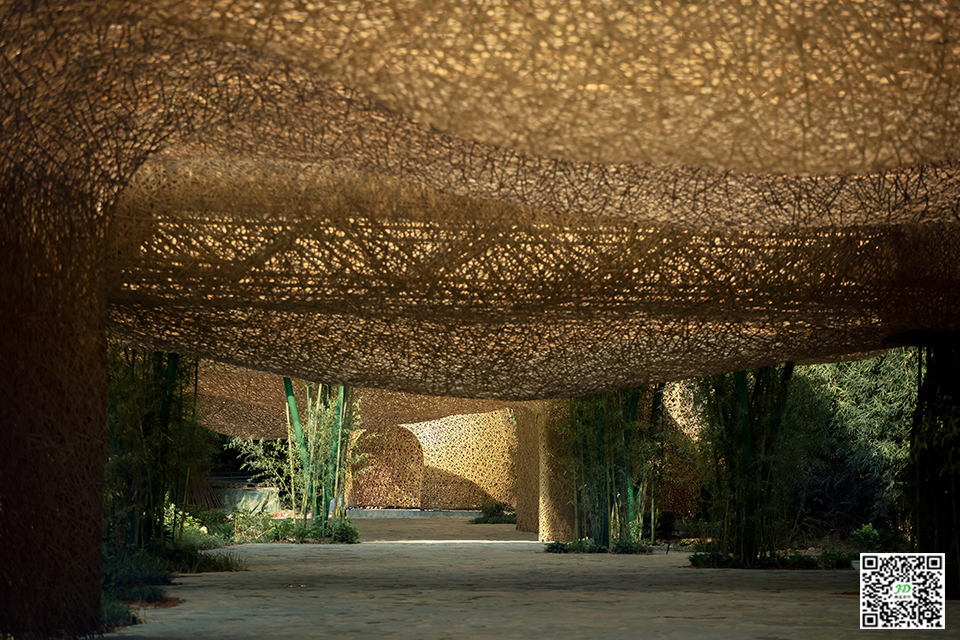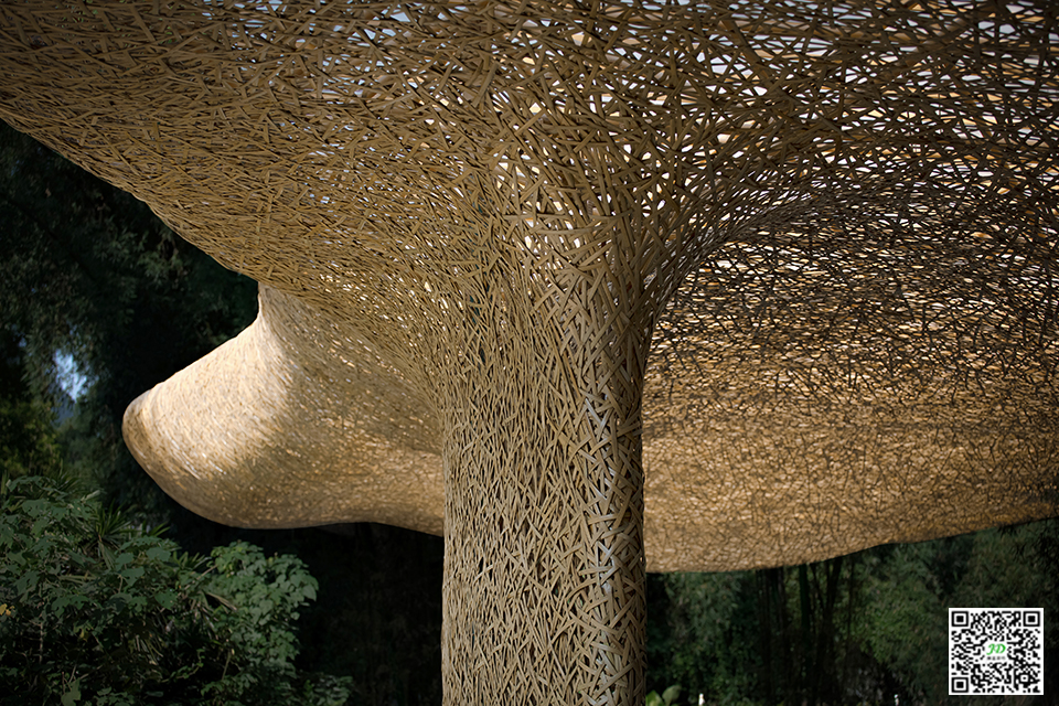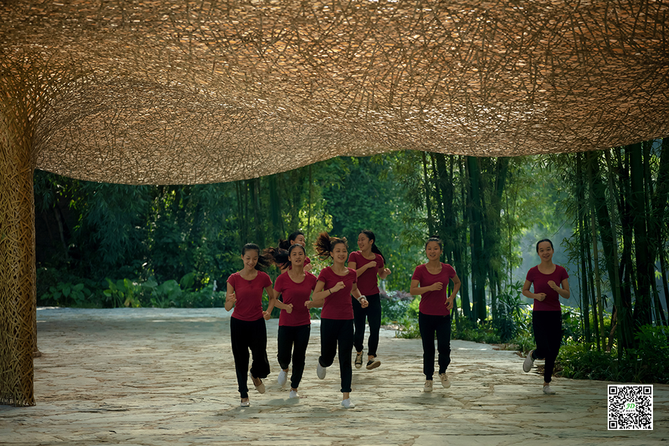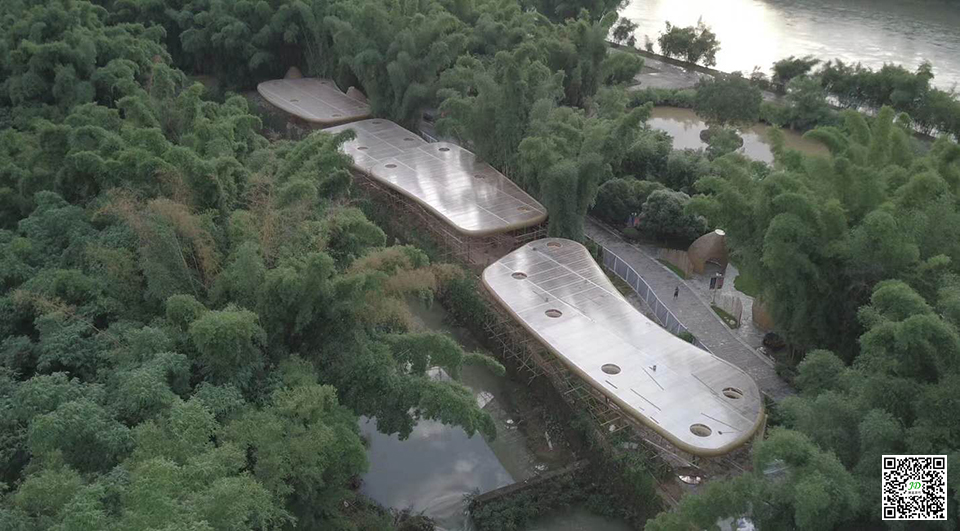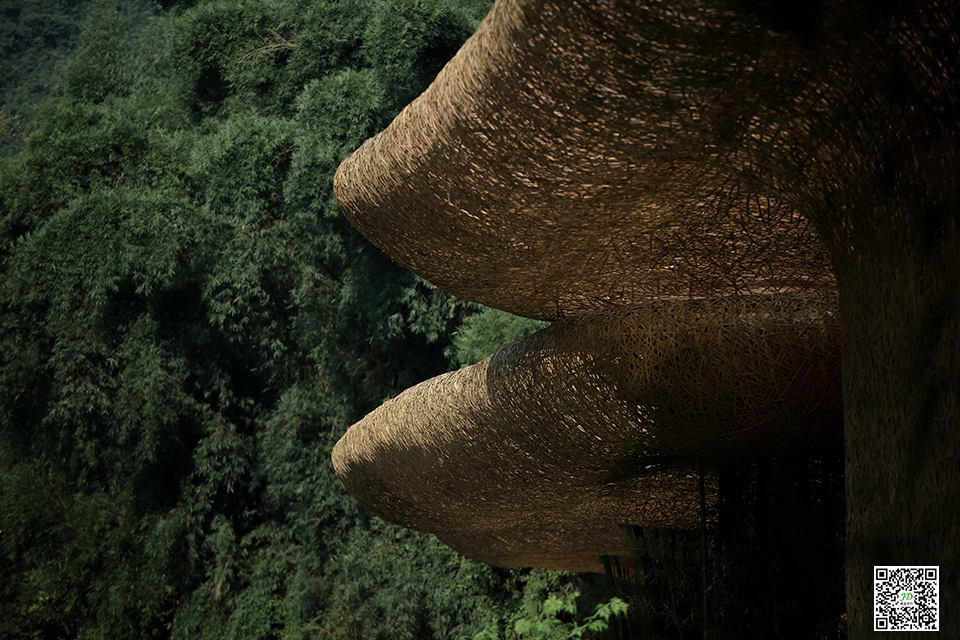 目前,大部分地区都覆盖有大片竹子,形成了竹林绿道长廊的竹结构。为了与已经存在的方式相吻合,新建筑考虑借用竹子的生长习性和其生长过程中形成的空间形态,将其重新配置以形成新的空间。这样的设计和实施策略,使新形成的空间不会与现有的自然环境相互竞争,同时却有呼应和强化的效果。尽管自然的手法,达到最佳效果需要过度时期和相对来说较长的时间,但这样的过程反而更能体现出这样可生长的设计策略的力量,同时增强了感受者与周围的竹林和丘陵的互动感和意识感。