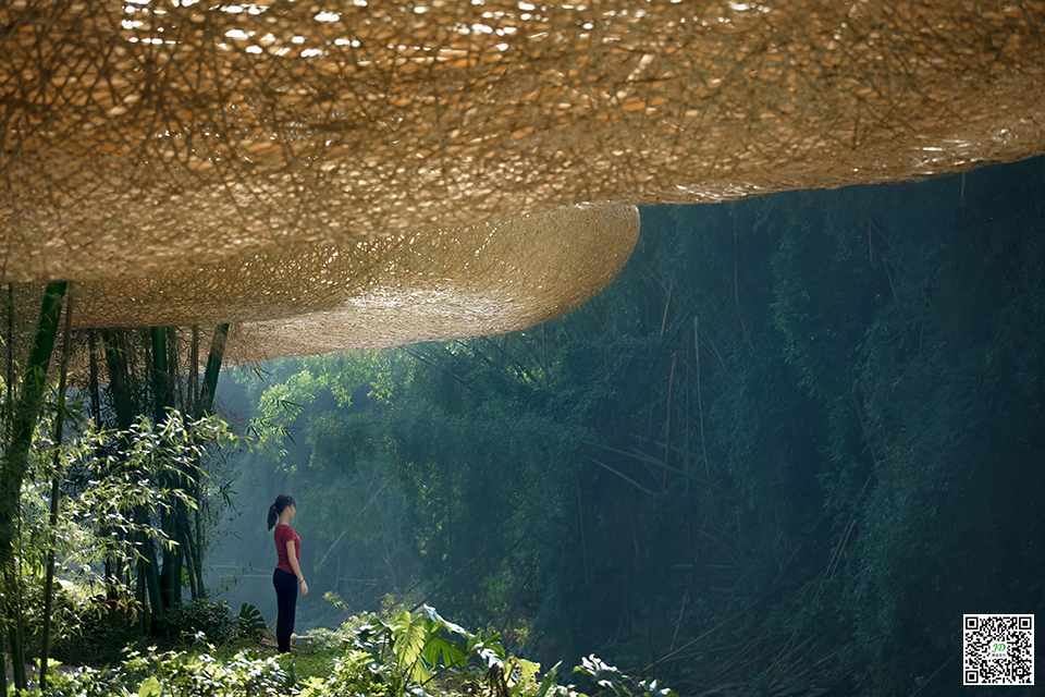 正是在这个中间模棱两可的空间里,项目的概念引入了两个新的体系以融合入现有的自然肌理同时形成一种情绪感知及故事文化的铺垫过程。第一个体系“竹灯未央”, 即手工竹编制成的灯笼结构空间,散落分布在访客入场流线的区域,以作为入场前感受印象刘三姐文化的体验/文创销售/休憩空间点。另一个体系“手工竹艺长廊”, 在竹丛之间形成一层手工编织高低错落的“竹网”,提供了可以避开常规降雨的步行区域。这两个竹体体系的创建和形成,则不仅仅是作为它们本身存在的属性,而它们与周围自然环境的材料上的,肢体上的,感受上的一种内外在的共鸣与呼应,则更是不断传递着层层更新的意义,使相互赋予更强更有活力的生命力。