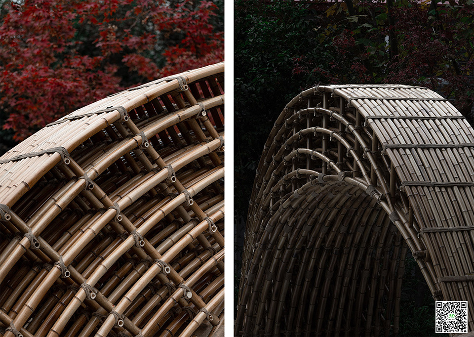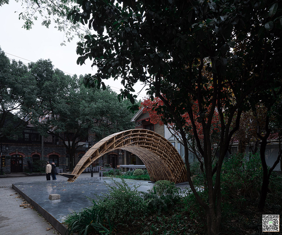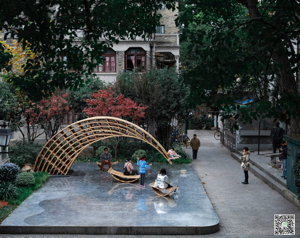 当密编的竹子垂弯而立得出现在这座城市的街角一隅,众人纷纷侧目,它不再是乡土中国质朴的生产性的经济作物,而是这个街道一个被展出的艺术品,抑或是人们记忆中的嬉间回忆。它似一座拔地而起的悬空的“竹椅”,对望着场地里的百年古树。