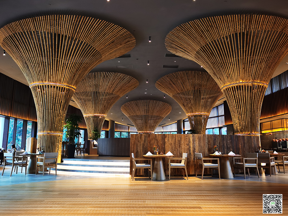 竹喇叭项目的设计延续御水温泉竹溪谷酒店的品牌主题,合理利用了餐厅的空间面积,充分发挥了竹子的天然特性,与南山竹海的美景相呼应,使人身心放松、心旷神怡。