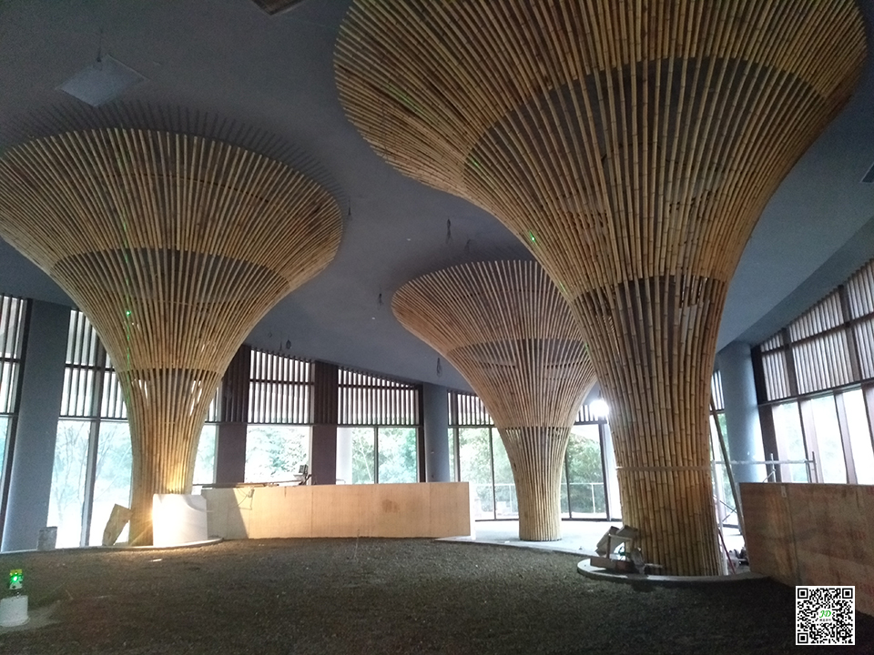该竹装饰整体呈喇叭状,高达6.5米,使用的材料为直径为50毫米的白竹,表面涂有环保油漆,经过了防虫防霉防火处理。竹子在施工现场经过火烤定型,再用镀锌螺丝固定在钢管圆环上,以此来达到由下到上逐渐外扩的喇叭形状。