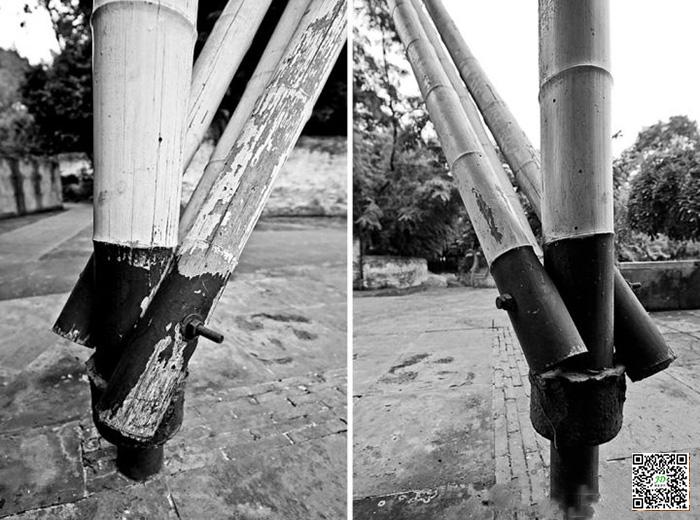 这里的竹节起到了将竹子纤维约束在一起的作用,同理,如果想要接地的竹结构不开裂,就需要用其它构件将其约束(简称“箍定”)。这一点如果做得不好,竹子就容易沿纵向开裂: