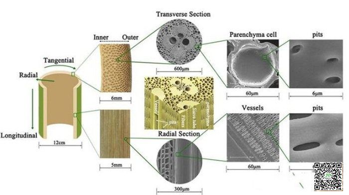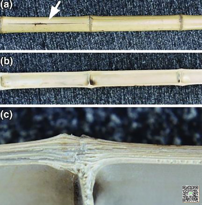 第二,竹子纤维的排布具有明显的方向性。大家都知道竹子能够快速生长,竹节之间的间距会逐渐变大。而竹子在每节之间的强度却并不高,其纤维结构呈纵向排布,像一系列平行排布的管道: