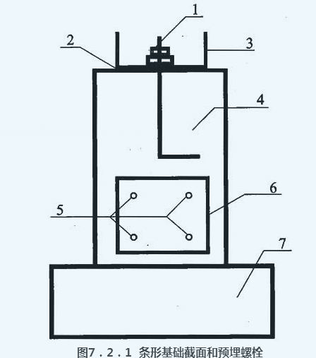 1-预埋螺栓;2-防水材料;3-导轨;4-素混凝土;5-钢筋;6-箍筋;7-混凝土垫层。