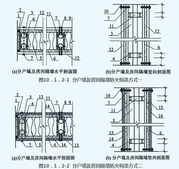 1 当墙体作为分户墙、房间隔墙及过道墙时,应设置双侧单层防火墙面板,防火墙面板内填充防火保温材料(图10.1.2-1、图10.1.2-2)。