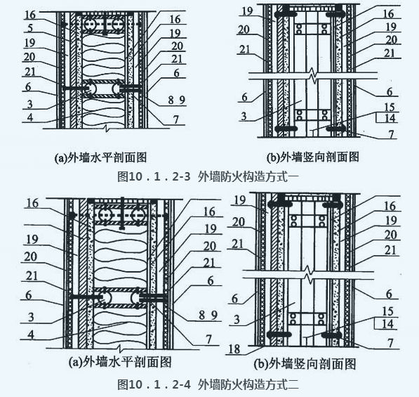 2 当组合墙体作为外墙时,应设置双侧双层防火板材,另装饰板材也应采用防火性能不低于难燃性B1级材料(图10.1.2-3、图10.1.2-4)。