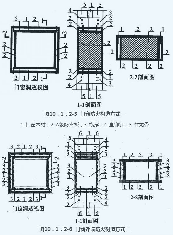 1-门窗木材;2-铺网;3-A级防火砂浆;4-横撑;5-直铆钉;6-竹龙骨