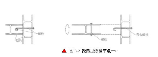 图3-2是另一种常见的螺栓连接方式,可以看作是对上文中问题3的回应。其具体做法为使用两根螺栓分别对穿两根需要连接的原竹竹秆,在其中一根螺栓的端部制作一个弯钩与另一个螺栓相连接。这种做法有效避免了对穿两根原竹竹秆带来的加工难度问题,但由于两根螺栓都在原竹竹筒内部,其连接较为困难,且由于没有有效的固定措施,容易造成脱落等问题。